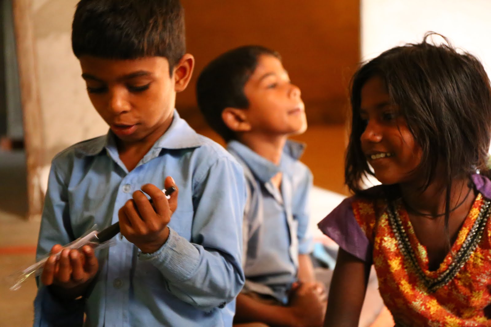 孩子們正拿著柯齊從台灣帶去的筆 |