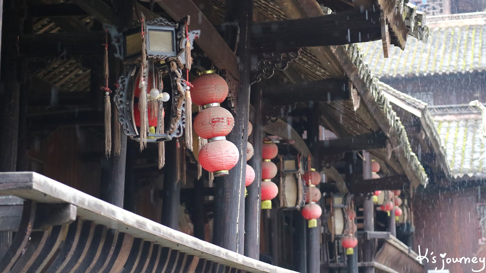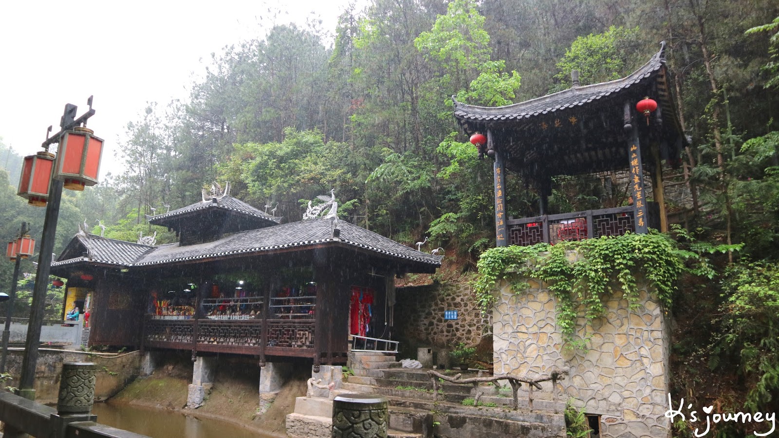 一旁是風雨橋,是還滿美的啦!當天剛好也下了小雨,照片不好拍,但別有一番韻味。沿著風雨橋往前走,會看到左手邊有祭祀土家族先祖的廩君殿。對面是標準的吊腳樓,裡面賣紀念品。