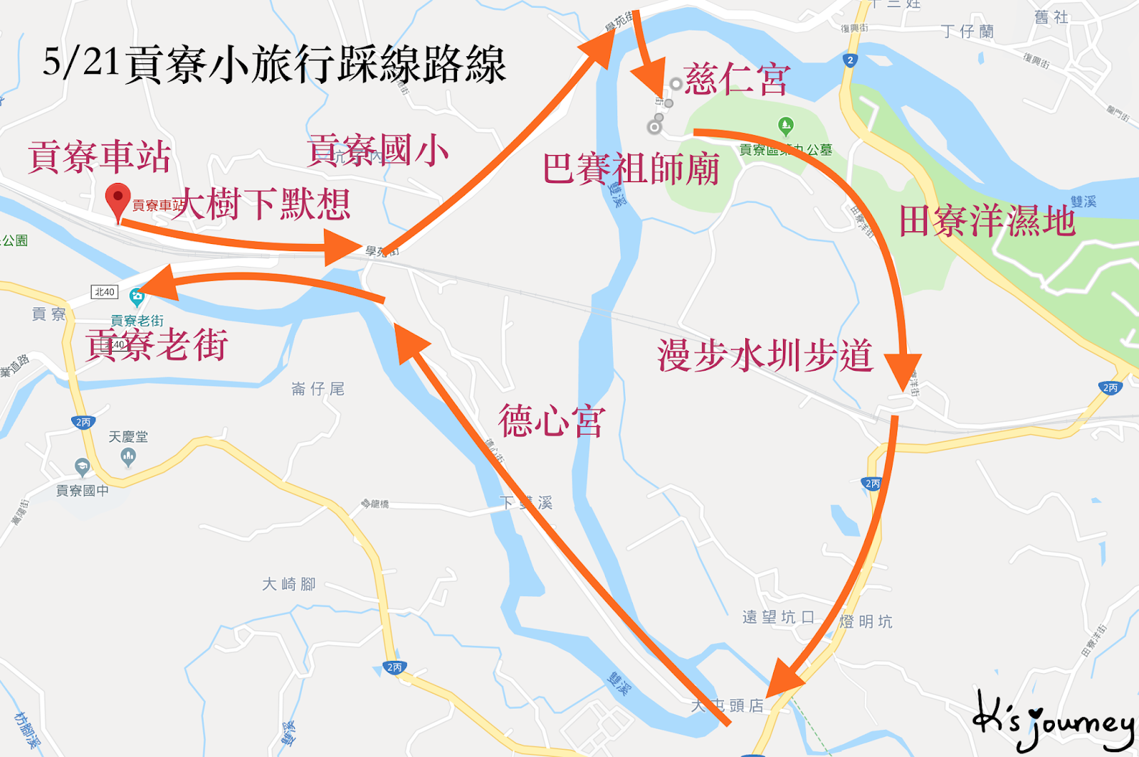馬偕總共來過宜蘭28次,每次都必須走上3天。這天(5/21),在小鎮生活陳順福老師(福哥)的帶領下,我們跟隨當初馬偕佈道旅行的路線,從淡蘭古道走到貢寮老街。以貢寮火車站為出發點,在豔陽下行走約5個小時,沿途看見綿延山巒、雙溪河流、清代古廟、平埔族老宅、青蔥稻田、愜意釣客、百年老街、黏人小貓、幾棟破房子和老街新希望。