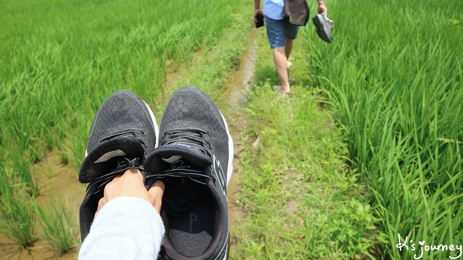 我們準備在鐵道涵洞休息用餐,福哥與同行的教授一時興起,脫下鞋子改走田埂直達涵洞。後來我們一行人也二話不說把鞋脫了,感受赤腳親吻土壤,被雜草搔癢的感覺。福哥說,馬偕也曾像我們這樣行走田埂間,當時天色昏暗,馬偕跌倒數次,發出聲響驚擾了部落,當地居民還舉著竹筒火把前來相救。
