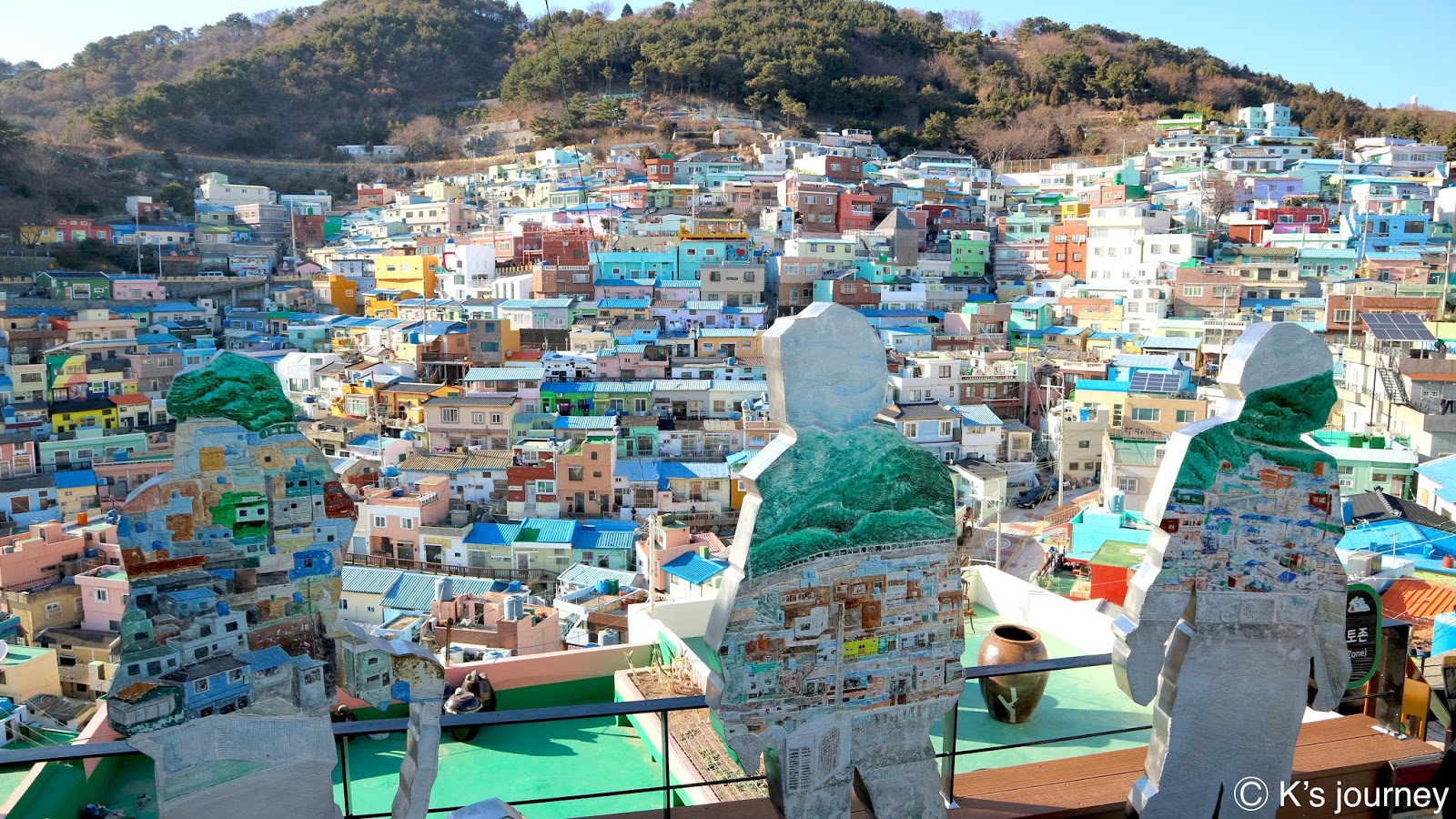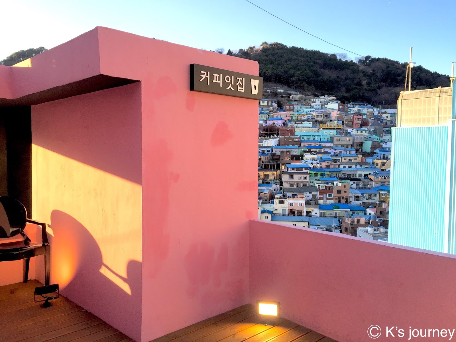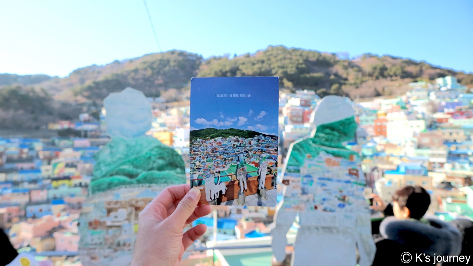 因朋友的一張明信片,我對釜山有了嚮往。有人說這裡是韓國版的「聖托里尼」或「馬丘比丘」,我倒覺得每個城市都有屬於自己的歷史記憶。甘川洞文化村獨特可愛,不需與誰相提並論,個人認為也不像其他地方啦!