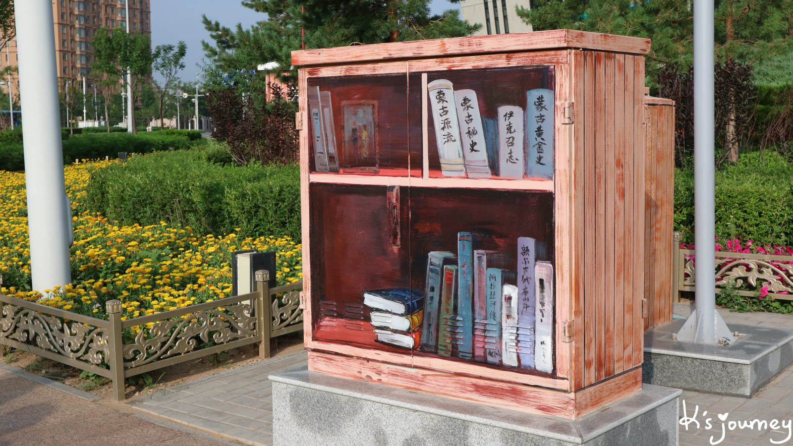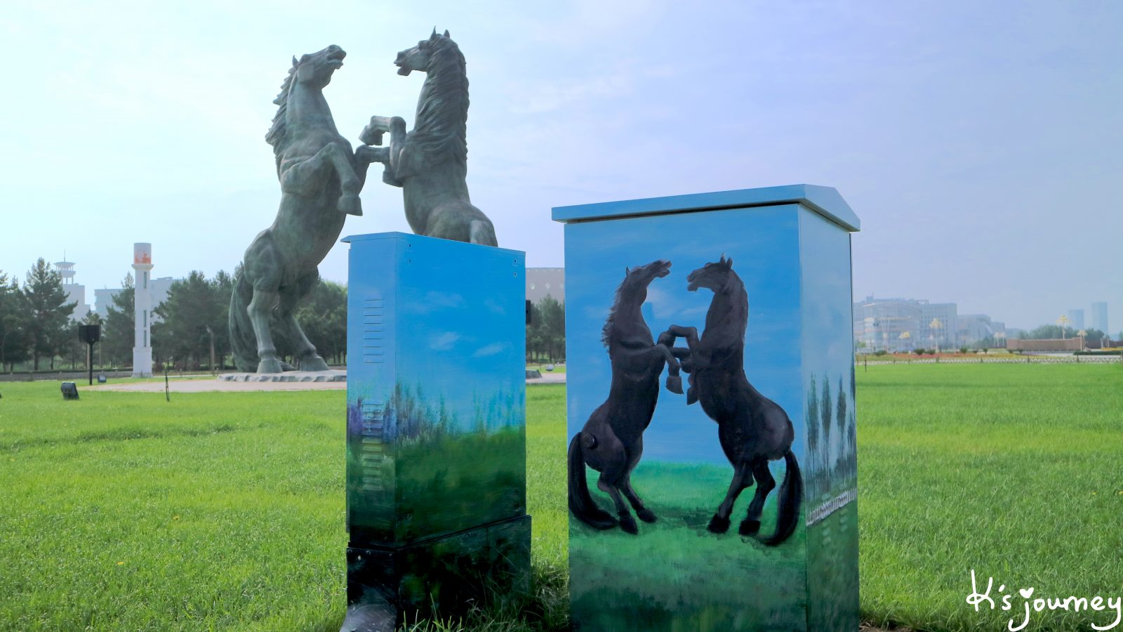 我還觀察到每個變電箱都長得不一樣!上面塗鴉竟與背景相呼應!如圖書館前就是畫一個書櫃、文化藝術中心則有國劇臉譜和跳舞女子、雙駒廣場就是畫兩匹馬。公園內的變電箱畫的樹種還跟身後的公園長得一模一樣!太逗趣了!真想將康巴什變電箱集好集滿!