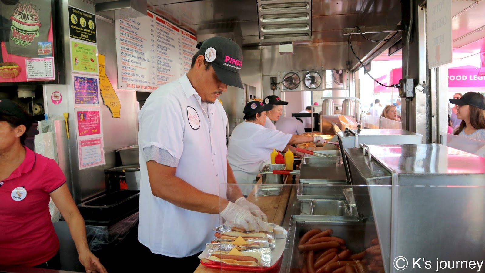 只見店員忙碌地打開烤箱,拿出熱狗、放下熱狗、塗著醬料、拿起薯條、煎漢堡肉…忙歸忙,卻有一定的節奏。