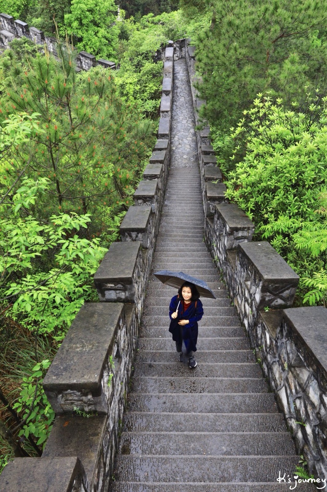 雖然上城牆前必須先爬一段高陡石階,但還好有上來,眼前根本就是小型的萬里長城嘛!覺得這是該景區最好看的地方!遊客不多,大概是不知道這條路,或是看到眼前階梯就放棄了吧!
