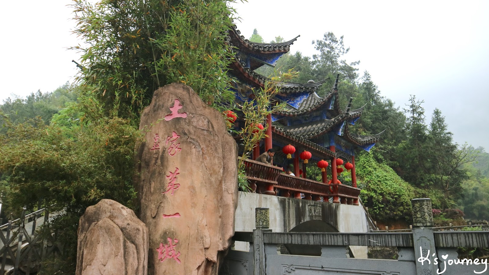 一旁是風雨橋,是還滿美的啦!當天剛好也下了小雨,照片不好拍,但別有一番韻味。沿著風雨橋往前走,會看到左手邊有祭祀土家族先祖的廩君殿。對面是標準的吊腳樓,裡面賣紀念品。
