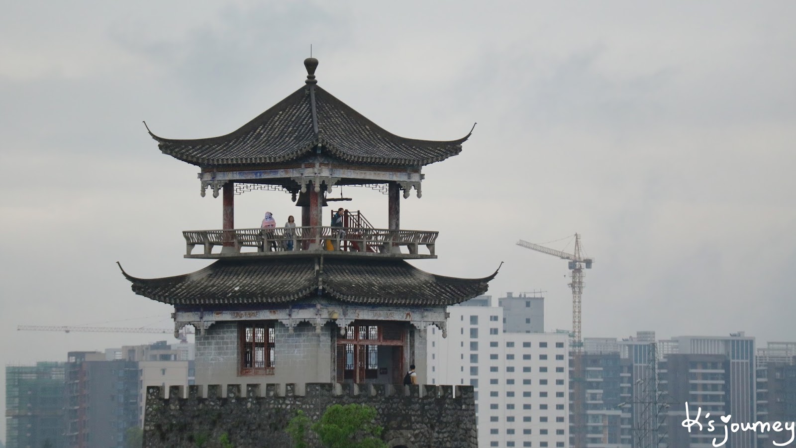城牆全長約2320公尺,依山勢修建,以抵禦外來敵人。上來後,向左走到鼓樓、向右走到鐘樓。我是爬到鼓樓望向鐘樓,風景挺壯觀的,可惜下雨啦!不然遠方景色肯定更棒!鐘樓一樣有飛簷造型,上面還掛了一只大銅鐘。