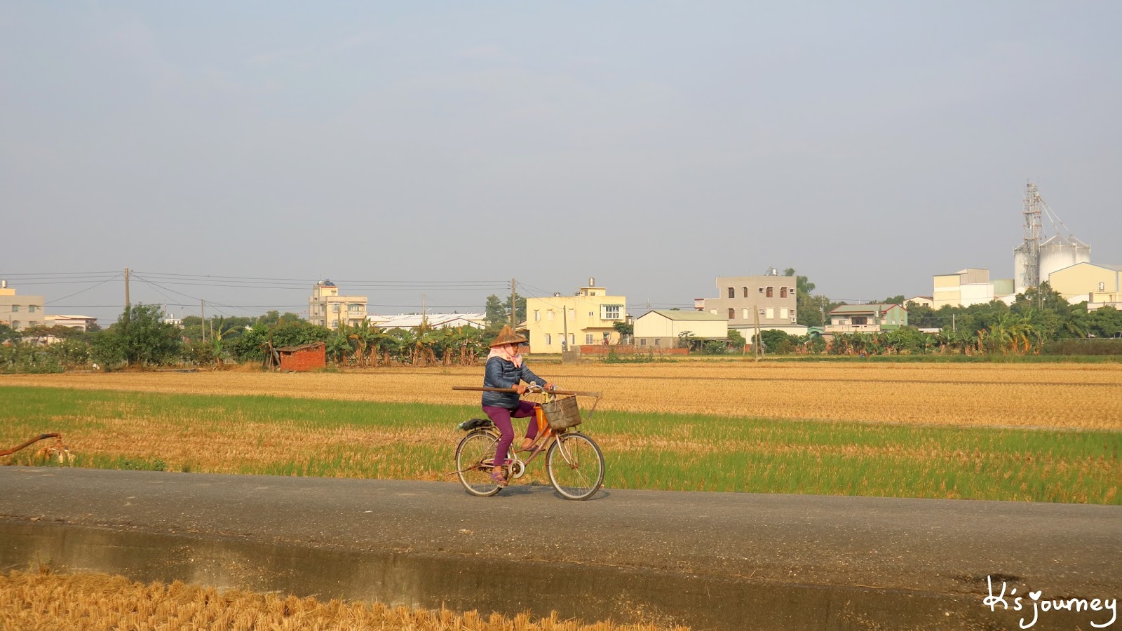 過了溪民路,繼續直行。這條平常真的沒什麼人經過。如果在12月初來,可以在附近田地看到一整片的稻草堆。舊鐵道已重新鋪上柏油,完全看不出鐵軌在哪。