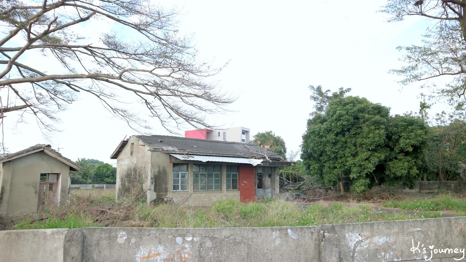 按網路資訊說,溪口車站隱身在附近房舍,但我怎麼找就是都找不到,可能已經完全拆除了吧!(如果鄉親們知道確切位置,歡迎留言給我喔!)沒找到月台,倒是看到了糖廠辦公室舊址!位於中山路和仁愛街交叉口,只是這裡早已人去樓空,鐵門深鎖不能進去。房屋破舊、雜草叢生,前院角落還有個防空洞。