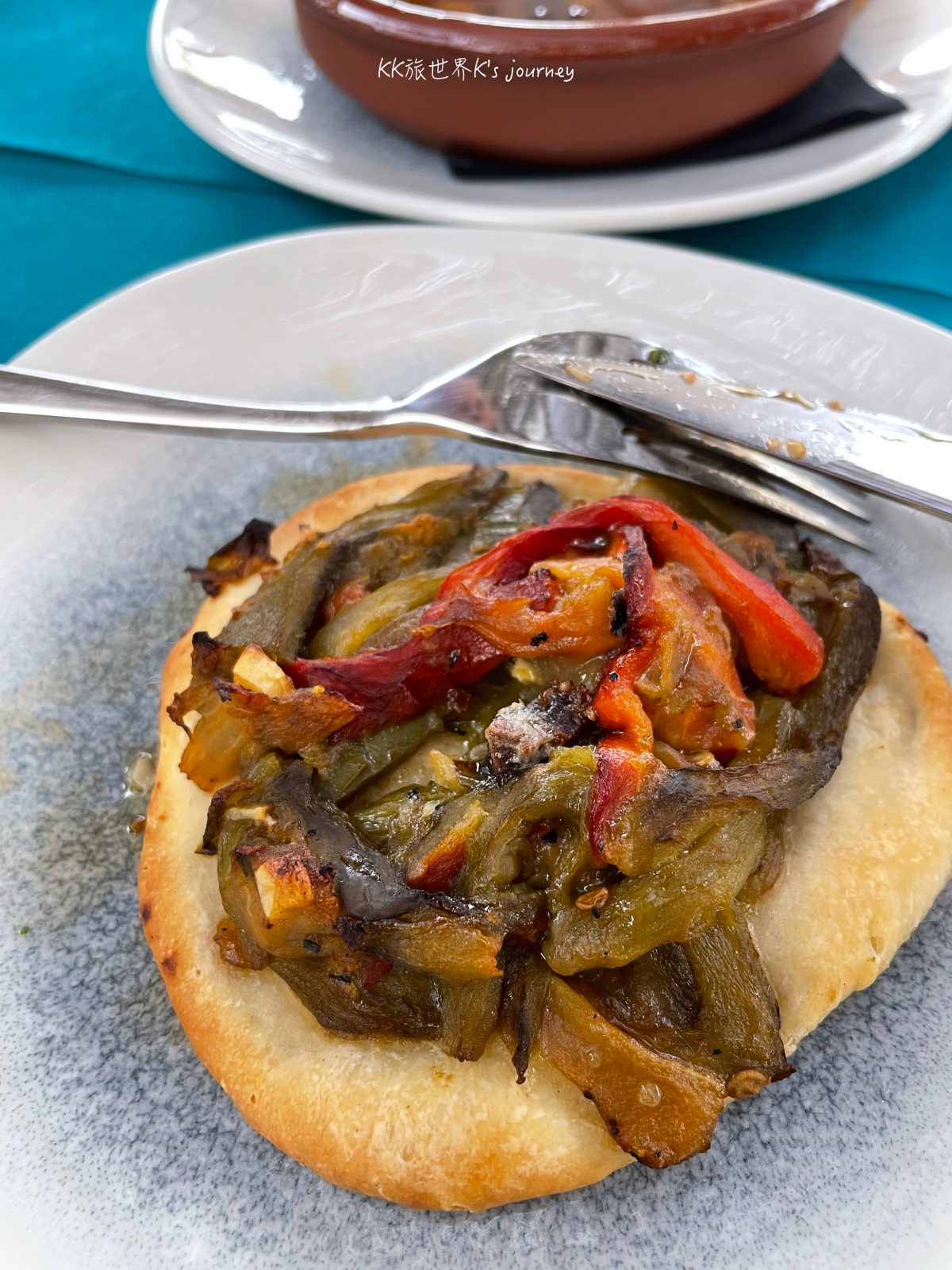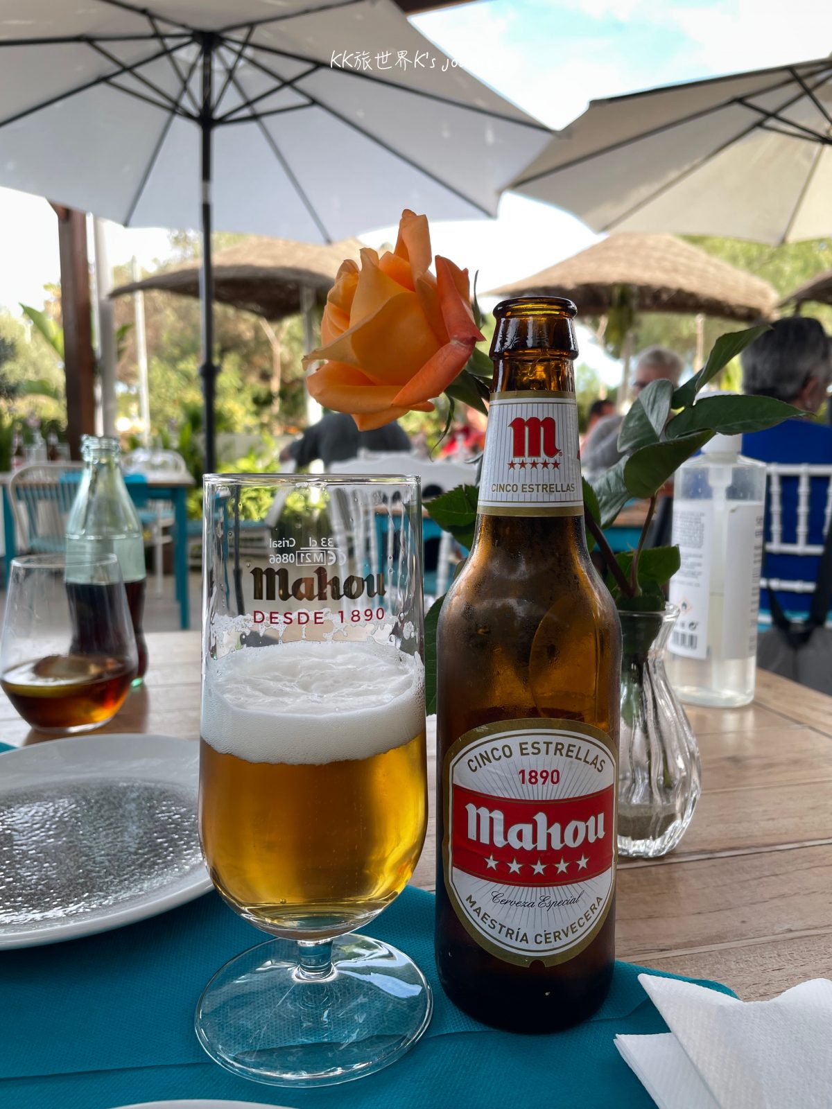 另外我們也點了兩道西班牙小食,蒜香蝦仁和口感很像Pizza的玉米烤餅,上面有一些蔬菜。當然在西班牙,餐餐都要配啤酒。這次我喝了西班牙國民啤酒Mahou,味道醇厚,初嚐口感略苦,後段尾韻回甘明顯。該品牌可是西班牙皇家馬德里足球隊官方指定啤酒呢!
