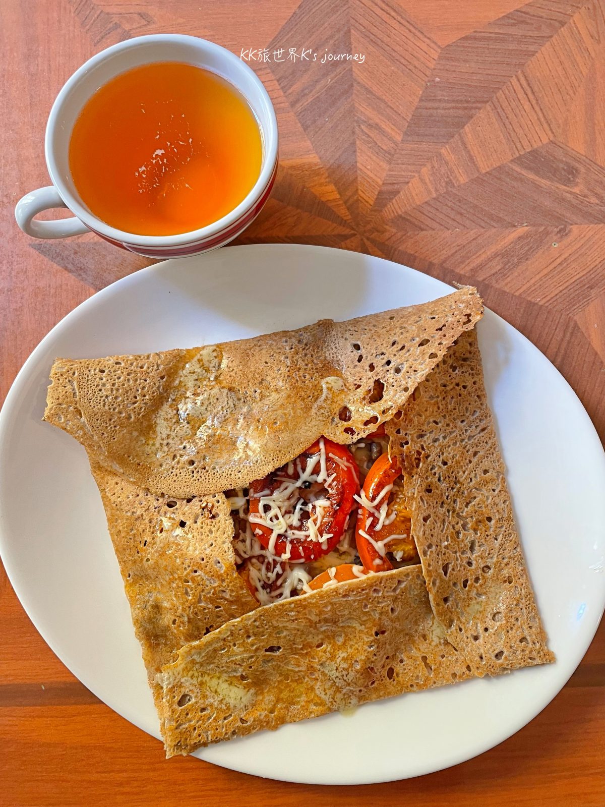 法國可麗餅有鹹甜兩種,搭配蘋果氣泡酒Cidre一起享用就是吃可麗餅的標配。我點了餡料是番茄、蘑菇加乳酪的鹹口味。一開動~Oh La La!餅皮脆口,鹹度適中,一口吃進嘴裡暖呼呼的太幸福了!