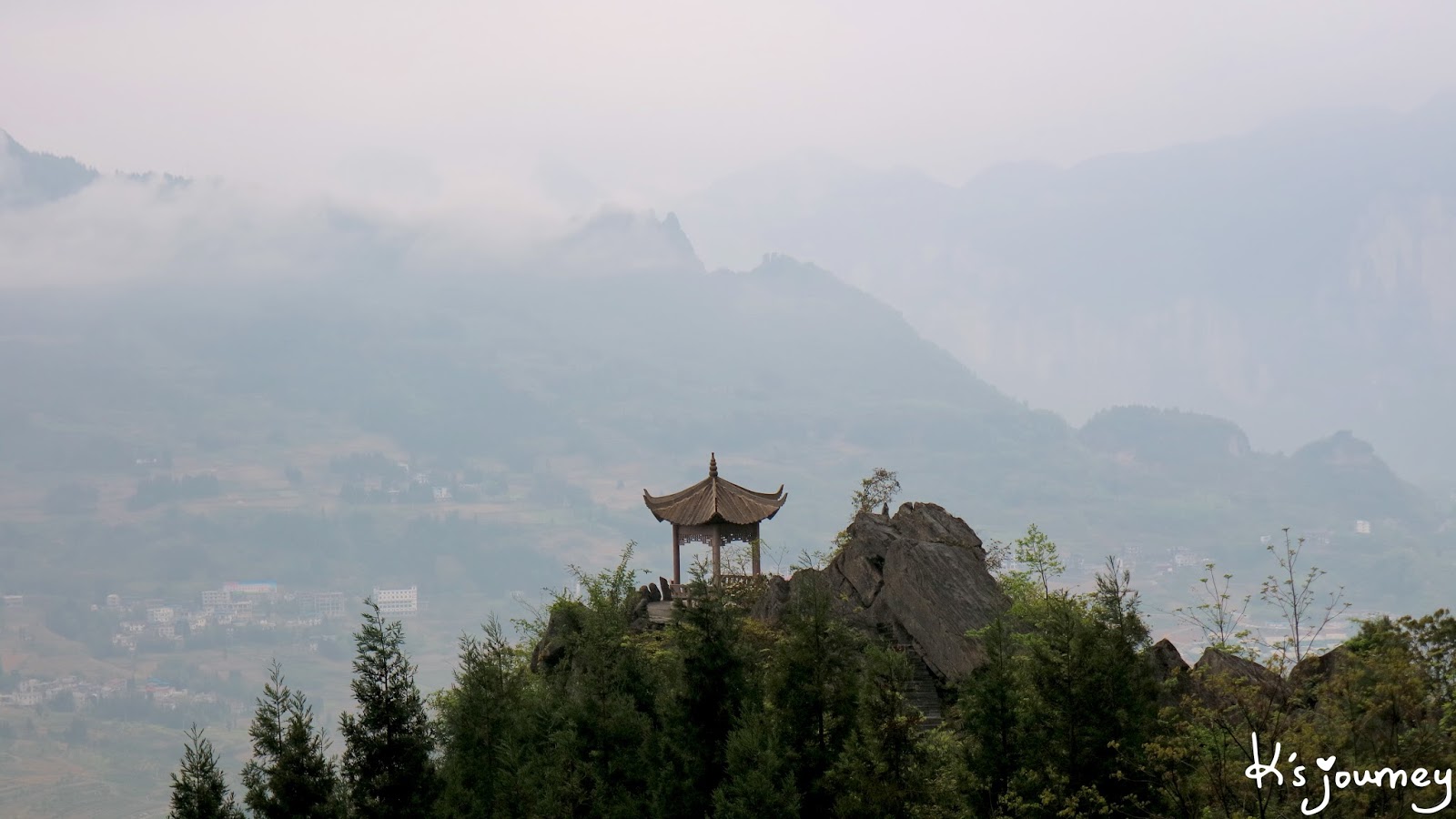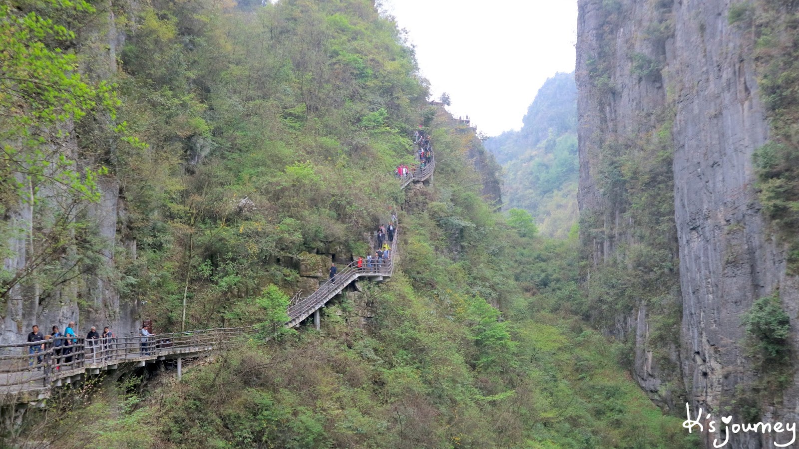 當天遠處濃霧籠罩著一座座遠山,拍照效果不佳,有點可惜。但我始終認為眼前景致有如中國山水畫般。有人說這裡是神仙居住的地方,雲來霧去足以讓世人忘卻煩惱。此刻的我,一種極度渺小的自卑感油然而生,也確實什麼都不想做、什麼都不想動,只想暫停一下,好好欣賞眼前風景。原來,恩施大峽谷很適合「佛系青年」!