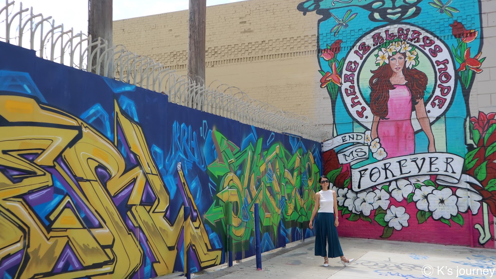 出發美國洛杉磯前,剛好看到平常關注的模特兒在那拍穿搭照,模特兒本身就美,但更吸引我的是照片背景!於是促成了LA拍一波計畫!有別於台灣彩繪村多以卡通人物圖案呈現,LA壁畫題材多元豐富,畫風以寫實或意象塗鴉為主,用色大膽繽紛,讓整座城市充滿生命力。
