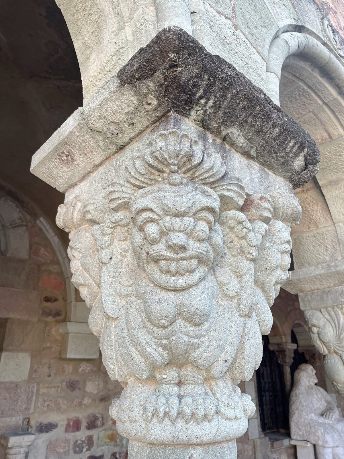 在導覽員的解說下,原來現在這裡是私人民宅。Château de la Napoule城堡建於14世紀,距今已有千年歷史。但歷經歲月風霜和法國大革命等戰亂,僅存部分為當年遺址。幾個世紀以來,城堡被改建多次,在19世紀還成了玻璃工廠。直到1918年來自美國紐約的藝術家夫妻檔Henry Clews和Marie Clews收購了這座城堡並搬進來住,兩人移居法國以尋求更大的藝術自由,花了17年時間改建,過程中除了保留城堡的古典美,也增加了不少他們的藝術風格創作。Henry Clews還是西班牙文學小說《唐吉訶德》的忠實粉絲,其雕塑作品靈感深受小說影響。