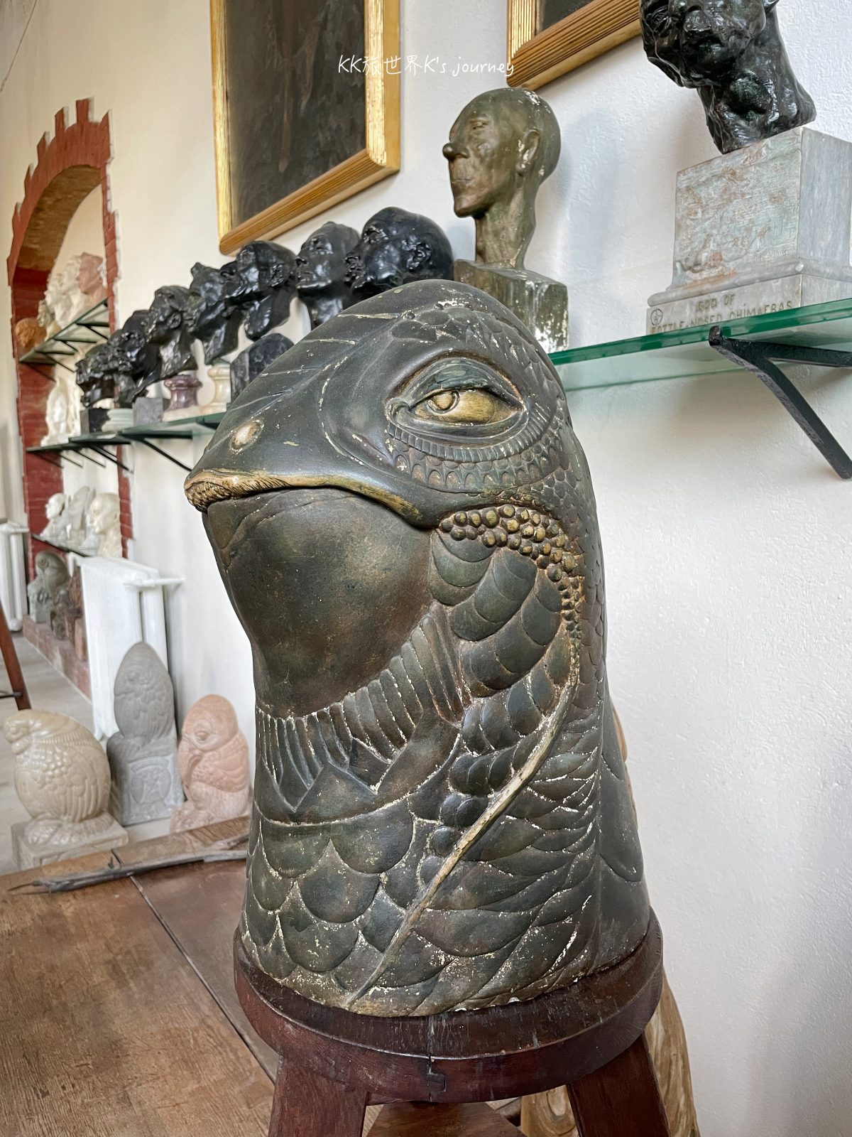 工作室擺滿兩人的創作,我看完的感想是覺得Henry的作品風格屬於暗黑系,帶點諷刺又有點厭世,好像在敘述著世道不公。而Marie則是雕塑家,負責古堡的整體設計,部分作品還帶有早期中國藝術風格元素,像是樑柱上的石雕,乍看下真的很像舞獅。
