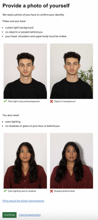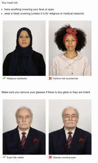 個人半身照一樣有規定,建議直接找一面白牆拍攝,因為背景不能有雜物。光線不能太暗,亮度均勻無影子,切勿修圖或加上濾鏡。臉或眼睛不能遮蓋,戴眼鏡者需脫掉眼鏡也不能配戴頭巾(除非是宗教信仰或疾病原因)如下圖所示。電腦上傳之照片檔案一樣須為jpg或jpeg。