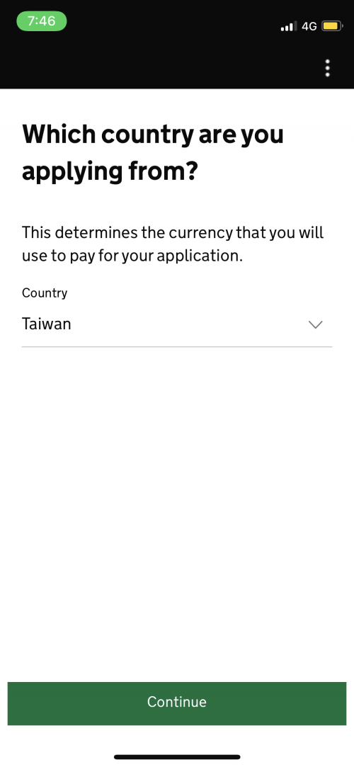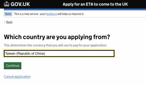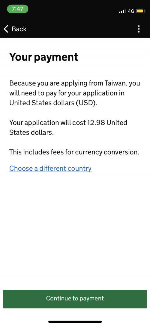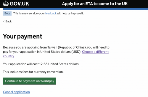 申請費用為£10,會需要先選擇從哪個國家申請,台灣的話是以美金計費,網站會以申請當下匯率計算實際金額。線上付款是透過英國支付平台Worldpay。