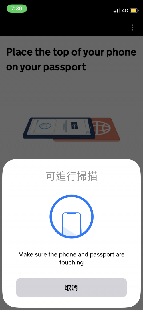 這裡花了我很多時間,需要將手機放在護照上滑動,app會偵測是否掃描成功。完成後上面就會出現護照條碼、號碼、簽發地和姓氏等資訊。