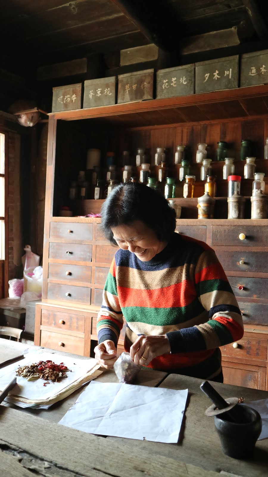 為親眼目睹劉阿嬤工作的樣子,剛才來訪的大哥大姊特地買了紅棗黃耆補湯藥包,劉阿嬤吩咐小女兒拿藥材,自己拿出壓箱寶-百年銅秤和鐵製搗藥缽,慢條斯理地配藥。大哥大姐離開前還說之後要帶攝影團30位朋友來參觀。對於該團參訪一事,即使劉阿嬤不確定他們是誰、為何會來,但來者是客,對隨和的劉阿嬤來說,溪口走向觀光是件好事,而日子一天天過,她的生活不會改變,還是早上去市場買菜,回來坐在店鋪裡,『唯一有差的就是以前常來的老人伴一個個走了,人變少了。』