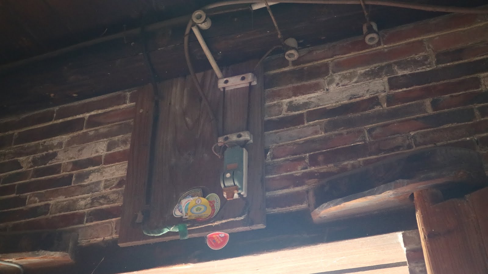 木造天花板留有置物空間可放藥材。黑色木頭是因為古時候都在屋內煎藥煙燻所致。特別的是房子建造之初所牽的電線還堪用,只不過不能接冷氣就是了,但這裡沒有裝冷氣的理由,相當通風!聊到一半,風從後門透進來,冷到劉阿嬤趕緊披上背心。