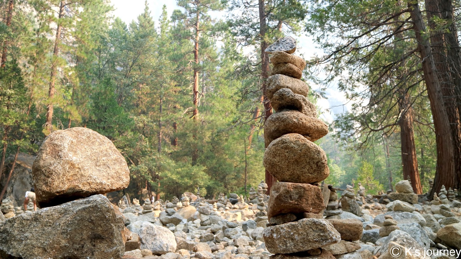 往優勝美地瀑布的途中,會看到一大片石頭區,不少遊客在此將石頭堆高,感覺很像某種祈福儀式,形成這邊的特殊景觀。